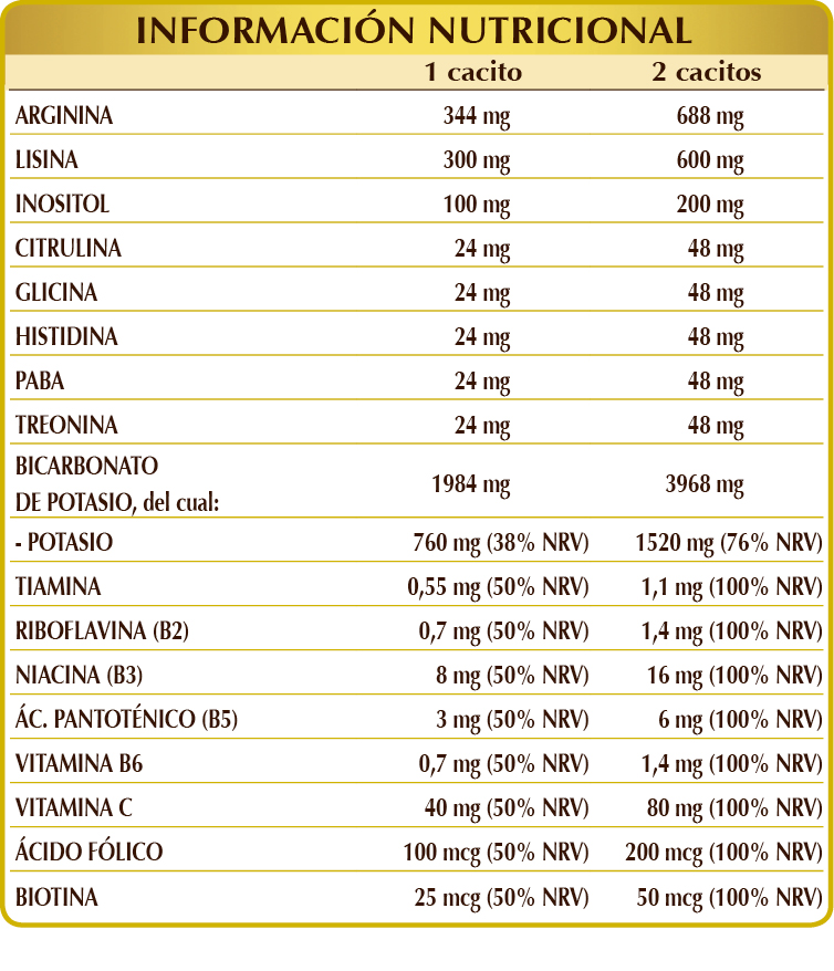 Maltodextrinas de maíz o arroz, bicarbonato de potasio, (L-)arginina, (L-)lisina HCL o clorhidrato, mio-inositol de origen vegetal (extracto de semillas de maíz), ascorbato de potasio, (L-)citrulina, glicina, (L-)histidina, PABA (ácido p-aminobenzoico), (L-)treonina; edulcorantes de origen natural: glucósidos esteviolicos de stevia, taumatina; vitamina B3 (nicotinamida), vitamina B5 (pantotenato de calcio), vitamina B2 activada (riboflavina 5-fosfato de sodio), vitamina B6 activada (piridoxal-5-fosfato), vitamina B1 (clorhidrato de tiamina), ácido fólico activado (L-metilfolato de calcio), biotina.