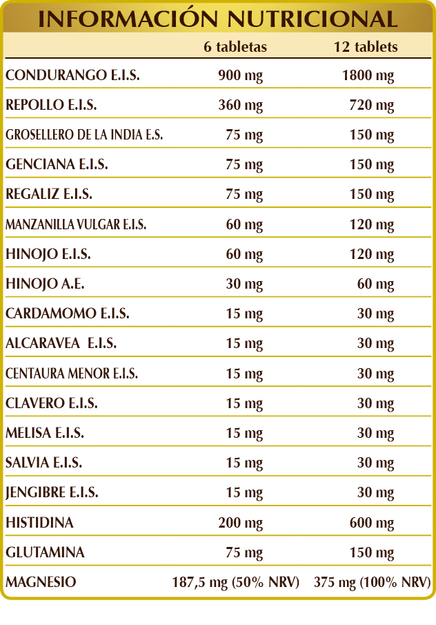 Condurango (Marsdenia condurango) cortezas del árbol E.I.S., repollo (Brassica oleracea var. capitata) hojas E.I.S., (L-)histidina, óxido de magnesio, carbonato de magnesio, trisilicato de magnesio°°, celulosa microcristalina°, goma arábiga°, grosellero de la India (Phyllanthus emblica) frutos E.S. (estandarizado al 30 % en taninos), genciana (Gentiana lutea) raíces E.I.S., (L-)glutamina, regaliz (Glycyrrhiza glabra) raíces E.I.S., manzanilla (Matricaria chamomilla) cálices (flores) E.I.S., hinojo (Foeniculum vulgare) frutos E.I.S., hinojo (Foeniculum vulgare) frutos A.E., cardamomo (Elettaria cardamomum) semillas E.I.S., alcaravea (Carum carvi) frutos E.I.S., centaura menor (Centaurium erythraea) sumidades E.I.S., clavero (Eugenia caryophyllata) yemas florales E.I.S., melisa (Melissa officinalis) hojas E.I.S., salvia (Salvia officinalis) hojas E.S., jengibre (Zingiber officinalis) rizomas E.I.S., estearato de magnesio de origen vegetal°°.