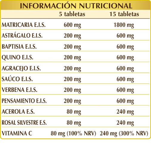 Matricaria (Tanacetum parthenium) hierba con flores E.I.L., astrágalo (Astragalus membranaceus) raíces E.I.L., baptisia (Baptisia tinctoria) raíces E.I.L., quino (Cinchona calisaya) cortezas E.I.L., agracejo (Berberis vulgaris) cortezas de las raíces E.I.L., saúco (Sambucus nigra) flores E.I.L., verbena (Verbena officinalis) hierba con flores E.I.L., violeta (Viola tricolor) hierba con flores E.I.L., celulosa microcristalina°, goma arábiga°, acerola (Malpighia glabra) frutos E.S. (titulado al 50 % en vitamina C), rosal silvestre (Rosa canina) frutos E.S. (titulado al 50 % en vitamina C), dióxido de silicio°°, estearato de magnesio de origen vegetal°°. °Agente de carga. °°Antiaglomerante.