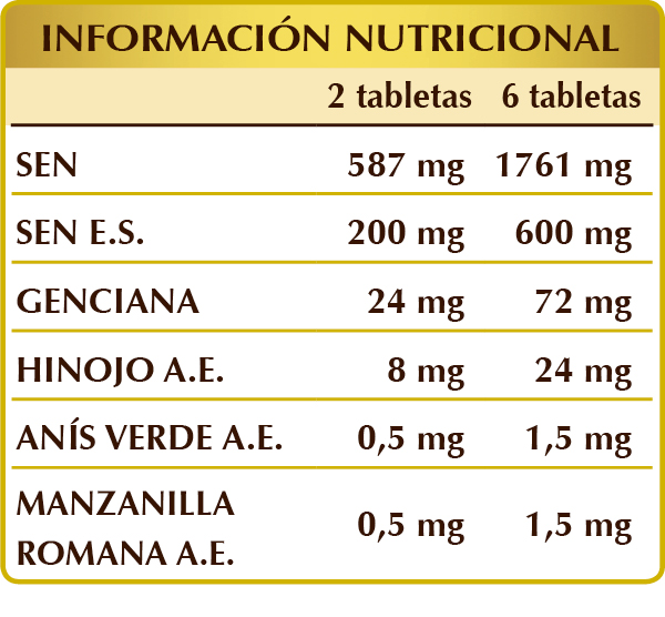 Sen (Cassia angustifolia) hojas polvo, sen (Cassia angustifolia) hojas E.S., celulosa microcristalina°, goma arábiga°, dióxido de silicio°°, genciana (Gentiana lutea) raíces polvo, estearato de magnesio de origen vegetal°°, hinojo (Foeniculum vulgare) frutos A.E., anís verde (Pimpinella anisum) frutos A.E., manzanilla romana (Anthemis nobilis) cálices (flores) A.E.