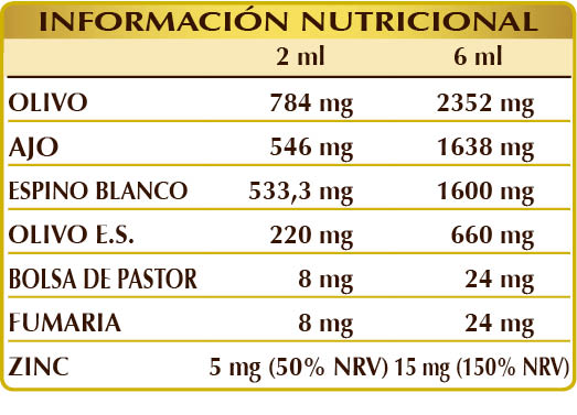 Agua pura, alcohol etílico (Alcoolvis®= alcohol purificado empleando el método inventado por Martino Giorgini), olivo (Olea europaea) hojas E.I.L., ajo (Allium sativum) bulbos frescos E.I.L., espino blanco (Crataegus oxyacantha) flores y hojas E.I.L., olivo (Olea europaea) hojas E.S. (titulado al 40 % en oleuropeína), gluconato de zinc, bolsa de pastor (Capsella bursa-pastoris) hierba E.I.L., fumaria (Fumaria officinalis) hierba con flores E.I.L.