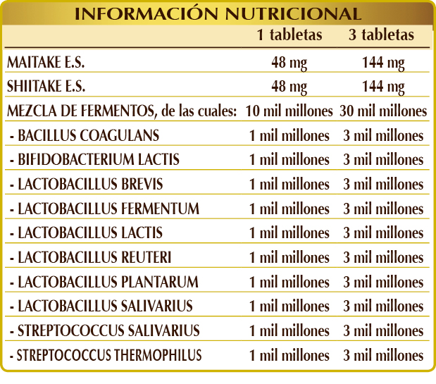 Celulosa microcristalina°, goma arábiga°, maitake (Grifola frondosa) talo E.S. (titulado al 30 % en polisacáridos), shiitake (Lentinula edodes) talo E.S. (titulado al 30 % en polisacáridos), maltodextrinas de maíz o arroz, mezcla de fermentos lácticos (titulada a 23,5 Mld/g en cada una de las siguientes cepas: Bacillus coagulans BCM9; Bifidobacterium lactis BALM27; Lactobacillus brevis LBRM45, fermentum LFM33, lactis LLM48, plantarum LPM27, reuteri LBRR16, salivarius LSM51; Streptococcus salivarius SSM12, thermophilus STM9), dióxido de silicio°°, estearato de magnesio de origen vegetal°°; edulcorantes de origen vegetal: glucósidos de esteviol y taumatina. °Agente de carga. °°Antiaglomerante.