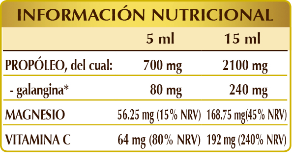 *flavonoides totales expresados en galangina. NRV= Valore Nutritivo di Riferimento.