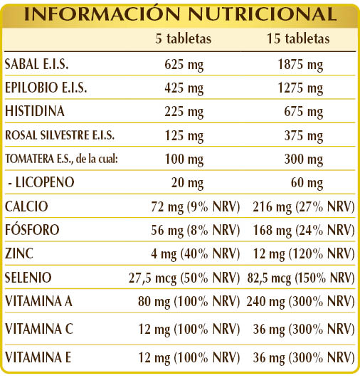 Serenoa o sabal (Serenoa repens o Sabal serrulata) frutos E.I.S., epilobio (Epilobium parviflorum) hierba E.I.S., goma arábiga°, celulosa microcristalina°, fosfato cálcico dibásico, (L-)histidina, rosa canina (Rosa canina) frutos E.I.S. (estandarizado al 70 % en vitamina C), dióxido de silicio°°, tomatera (Solanum lycopersicum) frutos E.S. (estandarizado al 10% en licopeno), estearato de magnesio de origen vegetal°°, vitamina E de origen vegetal (acetato de D-α-tocoferol), gluconato de zinc, vitamina A (acetato de retinol), selenito de sodio. °Agente de carga. °°Antiaglomerante