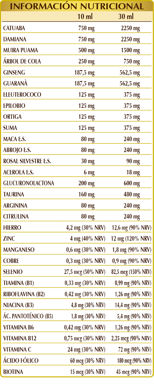 Glicerina vegetal bidestilada, agua pura, catuaba (Erythroxylum catuaba) cortezas E.I.L., damiana (Turnera diffusa) hojas E.I.L., muira puama (Ptychopetalum olacoides) madera E.I.L., árbol de cola (Cola nitida) semillas E.I.L., glucuronolactona, ginseng (Panax ginseng) raíces E.I.L., guaraná (Paullinia cupana) semillas verdes (no tostadas) E.I.L., taurina, eleuterococo (Eleutherococcus senticosus) raíces E.I.L., epilobio (Epilobium parviflorum) hierba E.I.L., ortiga (Urtica dioica) raíces E.I.L., suma o ginseng de Brasil (Pfaffia paniculata) raíces E.I.L., (L-)arginina, (L-)citrulina, maca (Lepidium meyenii) raíces E.S., abrojo (Tribulus terrestris) frutos E.S. (titulado al 90 % en saponinas), rosal silvestre (Rosa canina) frutos E.S. (titulado al 70 % en vitamina C), citrato férrico de amonio, gluconato de zinc, acerola (Malpighia glabra) frutos E.S. (titulado al 50 % en vitamina C), gluconato de manganeso, vitamina B3 (niacina), vitamina B5 (pantotenato de calcio), sulfato de cobre, vitamina B6 (clorhidrato de piridoxina), vitamina B2 (riboflavina), vitamina B1 (clorhidrato de tiamina), selenito de sodio, ácido fólico, biotina, vitamina B12 (cianocobalamina).