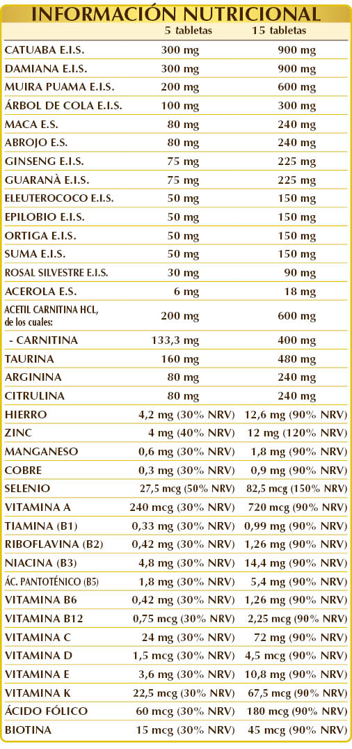 Catuaba (Erythroxylum catuaba) cortezas E.I.S., damiana (Turnera diffusa) hojas E.I.S., acetil (L-)carnitina HCL o clorhidrato, muira puama (Ptychopetalum olacoides) madera E.I.S., celulosa microcristalina°, goma arábiga°, taurina, árbol de cola (Cola nitida) semillas E.I.S., (L-)arginina, (L-)citrulina, maca (Lepidium meyenii) raíces E.S., abrojo (Tribulus terrestris) frutos E.S. (estandarizado al 90 % en saponinas), ginseng (Panax ginseng) raíces E.I.S., guaraná (Paullinia cupana) semillas (tostadas) E.I.S., eleuterococo (Eleutherococcus senticosus) raíces E.I.S., epilobio (Epilobium parviflorum) hierba E.I.S., ortiga (Urtica dioica) raíces E.I.S., suma o ginseng de Brasil (Pfaffia paniculata) raíces E.I.S., dióxido de silicio°°, gluconato de zinc, rosal silvestre (Rosa canina) frutos E.I.S. (estandarizado al 70 % en vitamina C), citrato férrico de amonio, estearato de magnesio de origen vegetal°°, vitamina E de origen vegetal (acetato de D-α-tocoferol), acerola (Malpighia glabra) frutos E.S. (estandarizado al 50 % en vitamina C), gluconato de manganeso, vitamina B3 (nicotinamida), vitamina B5 (pantotenato de calcio), vitamina A (acetato de retinilo), sulfato de cobre, vitamina B2 activada (riboflavina 5-fosfato de sodio), vitamina B6 activada (piridoxal-5-fosfato), líquen (Cladonia rangiferina) talo E.S. (estandarizado en vitamina D3 colecalciferol 100 000 UI/g), vitamina B1 (clorhidrato de tiamina), selenito de sodio, ácido fólico activado (L-metilfolato de calcio), vitamina K1 (filoquinona), biotina, vitamina B12 activada (5-deoxiadenosilcobalamina, metilcobalamina). °Agente de carga. °°Antiaglomerante