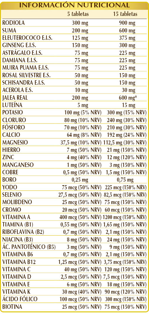 Rodiola (Rhodiola rosea) raíces Plv, glicerofosfato de magnesio, fosfato cálcico dibásico, jalea real liofilizada, suma o ginseng de Brasil (Pfaffia paniculata) raíces Plv, celulosa microcristalina°, goma arábiga°, cloruro de potasio, eleuterococo (Eleutherococcus senticosus) raíces E.I.S., ginseng (Panax ginseng) raíces E.I.S., astrágalo (Astragalus membranaceus) raíces E.I.S., damiana (Turnera diffusa) hojas E.I.S., muira puama (Ptychopetalum olacoides) madera E.I.S., rosal silvestre (Rosa canina) frutos E.S. (estandarizado al 70 % en vitamina C), schisandra (Schisandra chinensis) frutos E.I.S., tagete (Tagetes erecta) cálices (flores) E.S. (estandarizado al 10 % en luteína), citrato férrico de amonio, carbonato cálcico, estearato de magnesio de origen vegetal°°, citrato de potasio, gluconato de zinc, óxido de magnesio, vitamina E de origen vegetal (acetato de D-α-tocoferol), dióxido de silicio°°, acerola (Malpighia glabra) frutos E.S. (estandarizado a 50 % en vitamina C), gluconato de manganeso, vitamina B3 (nicotinamida), vitamina B5 (pantotenato de calcio), vitamina A (acetato de retinilo), sulfato de cobre, vitamina B2 activada (riboflavina 5-fosfato de sodio), vitamina B6 activada (piridoxal-5-fosfato), líquen (Cladonia rangiferina) talo E.S. (estandarizado en vitamina D3 colecalciferol 100 000 UI/g), vitamina B1 (clorhidrato de tiamina), picolinato de cromo, ácido fólico activado (L-metilfolato de calcio), yoduro de potasio, molibdato de sodio, selenito de sodio, vitamina K1 (filoquinona), biotina, vitamina B12 activada (5-deoxiadenosilcobalamina, metilcobalamina).