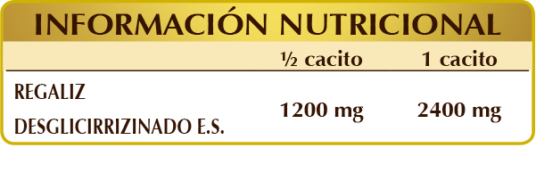 Extracto seco desglicirricinado de regaliz (Glycyrrhiza glabra) raíces (titulado al 3 % en ácido glicirrícico o glicirricina), altodextrinas de maíz o arroz; edulcorantes de origen natural: glucósidos de esteviol de stevia, taumatina.
