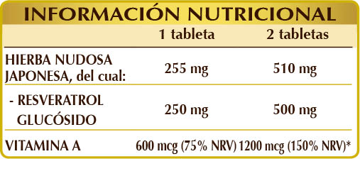 Complemento alimenticio a base de extracto de hierba nudosa japonesa, rico en glucósido de resveratrol y vitamina A. La hierba nudosa japonesa tiene múltiples propiedades: favorece las funciones depurativas, el drenaje de los líquidos corporales, la fluidez de las secreciones bronquiales, la regularidad del ciclo menstrual y el buen funcionamiento del aparato cardiovascular; además, ejerce una acción antioxidante y tiene un efecto tónico, siendo este último útil para combatir el cansancio físico y mental. La vitamina A, por su parte, interviene en el proceso de especialización de las células, contribuye a mantener la piel, las membranas mucosas y la capacidad visual en buen estado y es esencial para el correcto funcionamiento del sistema inmunitario.