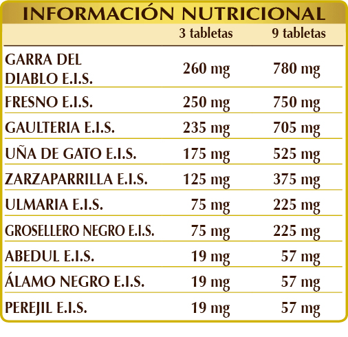 Garra del diablo (Harpagophytum procumbens) raíces E.I.S., fresno (Fraxinus excelsior) hojas E.I.S., gaulteria (Gaultheria procumbens) hojas E.I.S., uña de gato (Uncaria tomentosa) cortezas E.I.S., celulosa microcristalina°, goma arábiga°, zarzaparrilla (Smilax medica) raíces E.I.S., ulmaria (Filipendula ulmaria) hierba E.I.S., grosellero negro (Ribes nigrum) hojas E.I.S., dióxido de silicio°°, abedul blanco (Betula alba o pubescens) hojas E.I.S., álamo (Populus nigra) yemas E.I.S., perejil (Petroselinum crispum) raíces E.I.S., estearato de magnesio de origen vegetal°°. °Agente de carga