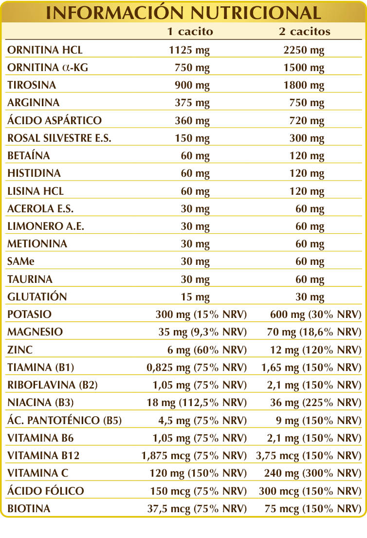 Maltodextrinas de maíz o arroz, (L-)ornitina HCL o clorhidrato, (L-)tirosina, citrato de potasio, (L-)ornitina α-cetoglutarato (OKG), dextrosa, (L-)arginina, ácido (L-)aspártico, citrato de magnesio, rosal silvestre (Rosa canina) frutos E.S. (estandarizado al 70 % en vitamina C), limonero (Citrus limon) frutos J.D., gluconato de potasio; corrector de acidez: ácido cítrico; pidolato de magnesio, gluconato de magnesio, betaína, (L-)lisina HCL o clorhidrato, (L-)histidina, SAMe (S-adenosil metionina), gluconato de zinc, acerola (Malpighia glabra) frutos E.S. (titulado al 50 % en vitamina C), limonero (Citrus limon) cáscaras de los frutos A.E., (L-)metionina, taurina, vitamina B3 (nicotinamida), glutatión, vitamina B5 (pantotenato de calcio); edulcorantes naturales: glucósidos de esteviol de stevia, taumatina; vitamina B2 activada (riboflavina 5-fosfato sódico), vitamina B6 activada (piridoxal-5-fosfato), vitamina B1 (clorhidrato de tiamina), ácido fólico activado (L-metilfolato cálcico), biotina, vitamina B12 activada (5-desoxiadenosilcobalamina, meticobalamina).