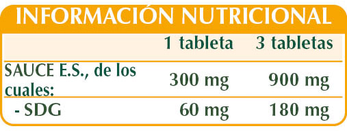 Sauce blanco (Salix alba) corteza E.S. (estandarizado al 40% en SALICINA), celulosa microcristalina°, goma arábiga°, dióxido de silicio°°, estearato de magnesio de origen vegetal°°. °Agente de carga. °°Antiaglomerante