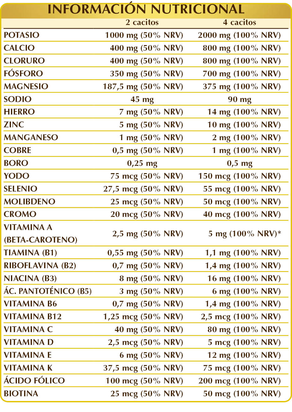 Maltodextrinas de maíz o arroz, gluconato de calcio, citrato de potasio, citrato de magnesio dibásico, limonero (Citrus limon) frutos J.D., cloruro de potasio, glicerofosfato de magnesio; corrector de acidez: ácido cítrico; citrato de sodio, fosfato potásico dibásico, citrato férrico de amonio, gluconato de zinc, vitamina C (ácido ascórbico), dunaliella (Dunaliella salina) talo (alga) E.S. (estandarizado al 10 % en beta-caroteno), vitamina E (acetato de DL-α-tocoferilo); edulcorantes de origen natural: glucósidos de esteviol procedentes de la stevia, taumatina; gluconato de manganeso, vitamina B3 (nicotinamida), gluconato de cobre, vitamina B5 (pantotenato de calcio), borato de sodio, vitamina B2 activada (riboflavina 5-fosfato de sodio), vitamina D3 (colecalciferol 100.000 UI/g), vitamina B6 activada (piridoxal-5-fosfato), vitamina B1 (clorhidrato de tiamina), ácido fólico activado (L-metilfolato de calcio), cloruro de cromo, yoduro de potasio, molibdato de sodio, selenito de sodio, vitamina K1 (filoquinona), biotina, vitamina B12 activada (5-desoxiadenosilcobalamina, metilcobalamina).