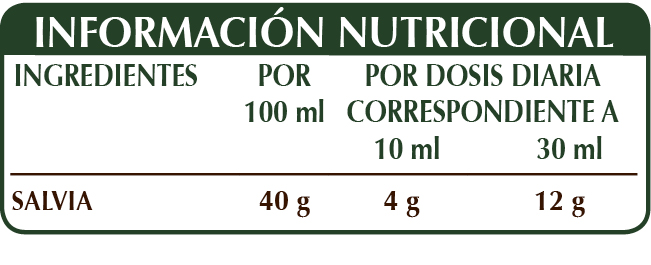 Extracto integral líquido sin alcohol obtenido a partir de: glicerina vegetal bidestilada, agua pura, salvia (Salvia officinalis) hojas.