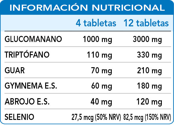Glucomanano (Amorphophallus konjac) raíces polvo (titulado al 90 % en fibras alimenticias), celulosa microcristalina°, goma arábiga°, (L-)triptófano, guar (Cyamopsis tetragonoloba) semillas polvo, gymnema (Gymnema sylvestre) hojas E.S. (titulado al 75% en ácido gimnémico), abrojo (Tribulus terrestris) frutos E.S. (titulado al 90 % en saponinas), maltodextrinas de maíz o arroz, dióxido de silicio°, gelatina alimentaria°°, estearato de magnesio de origen vegetal°°, selenito de sodio.