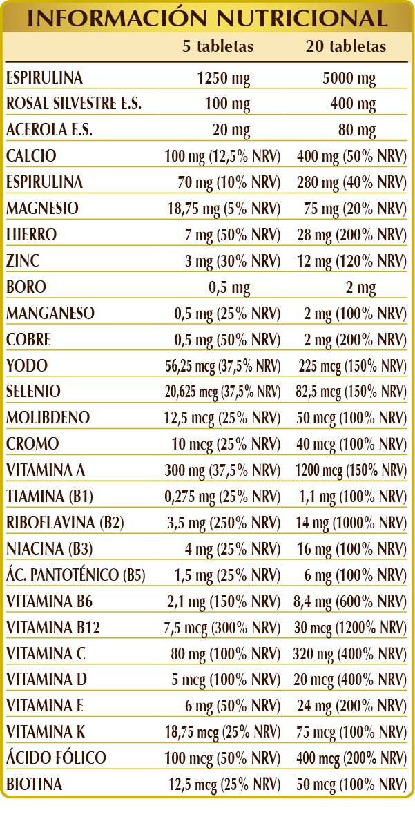 Espirulina (Spirulina maxima) alga unicelular polvo, fosfato cálcico dibásico, celulosa microcristalina°, goma arábiga°, rosal silvestre (Rosa canina) frutos E.I.S. (titulado al 70 % en vitamina C), gluconato de hierro, carbonato cálcico, glicerofosfato de magnesio, óxido de magnesio, dióxido de silicio°°, gluconato de zinc, acerola (Malpighia glabra) frutos E.S. (titulado al 50 % en vitamina C), vitamina E de origen vegetal (acetato de D-α-tocoferol), estearato de magnesio de origen vegetal°°, vitamina B2 activada (riboflavina 5-fosfato de sodio), sodio borato, gluconato de manganeso, vitamina B3 (nicotinamida), vitamina B6 activada (piridoxal-5-fosfato), vitamina A (acetato de retinilo), líquen (Cladonia rangiferina) tallo E.S. (titulado en vitamina D3 colecalciferol 100 000 UI/g), sulfato de cobre, vitamina B5 (pantotenato de calcio), vitamina B1 (clorhidrato de tiamina), ácido fólico activado (L-metilfolato de calcio), cromo picolinato, yoduro de potasio, selenito de sodio, molibdato de sodio, vitamina K1 (filoquinona), biotina, vitamina B12 activada (5-deoxiadenosilcobalamina, metilcobalamina).° Agente de carga. °°Antiaglomerante.