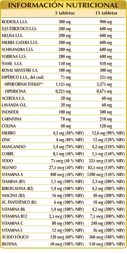 Rodiola (Rhodiola rosea) raíces E.S. (titulado al 3 % en rosavina y al 1 % en salidrósidos), eleuterococo (Eleutherococcus senticosus) raíces E.I.S., melisa (Melissa officinalis) hojas E.I.S., hierba gatera (Nepeta cataria) hierba con flores E.I.S., schisandra (Schisandra chinensis) frutos E.I.S., verbena (Verbena officinalis) hierba con flores E.I.S., celulosa microcristalina°, goma arábiga°, ñame (Dioscorea opposita) rizomas E.S. (titulado al 16 % en diosgenina), mio-inositol, rosal silvestre (Rosa canina) frutos E.S. (titulado al 70 % en vitamina C), tartrato de colina, carnitina, hipérico (Hypericum perforatum) hierba con flores E.S. (titulado al 0,3 % en hipericina, relación hiperforinas/hipericina = 5), dióxido de silicio°°, gluconato de hierro, gluconato de zinc, vitamina E de origen vegetal (acetato de D-α-tocoferol), acerola (Malpighia glabra) frutos E.S. (titulado al 50 % en vitamina C), lavanda (Lavandula officinalis) sumidades floridas A.E., gluconato de manganeso, vitamina B3 (nicotinamida), estearato de magnesio de origen vegetal°°, vitamina B5 (pantotenato de calcio), gluconato de cobre, vitamina A (acetato de retinol), vitamina B6 (clorhidrato de piridoxina), vitamina B2 (riboflavina), vitamina B1 (clorhidrato de tiamina), ácido fólico, yoduro de potasio, selenito de sodio, biotina, vitamina B12 (cianocobalamina). °Agente de carga. °°Antiaglomerante.