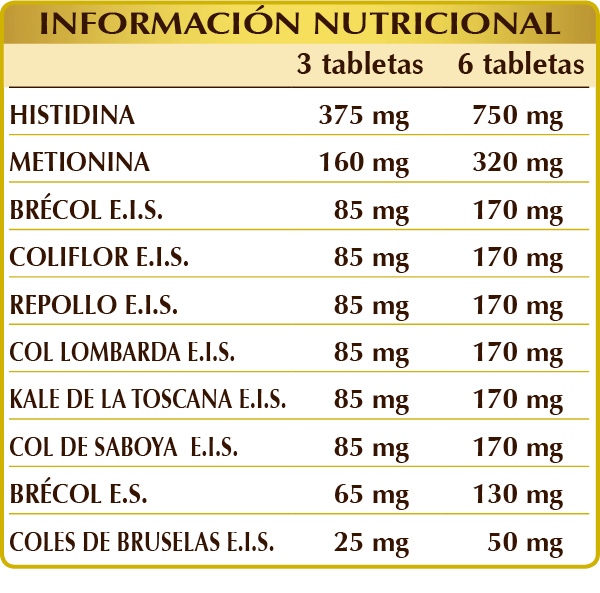 Complemento alimenticio a base de extracto de brécol y repollo enriquecido con histidina y metionina. El brécol, la coliflor y todas las especies de repollo empleadas para la preparación del extracto poseen una acción antioxidante, favorecen el buen funcionamiento del aparato cardiovascular, estimulan la función digestiva y contribuyen a mantener la buena salud de las articulaciones.