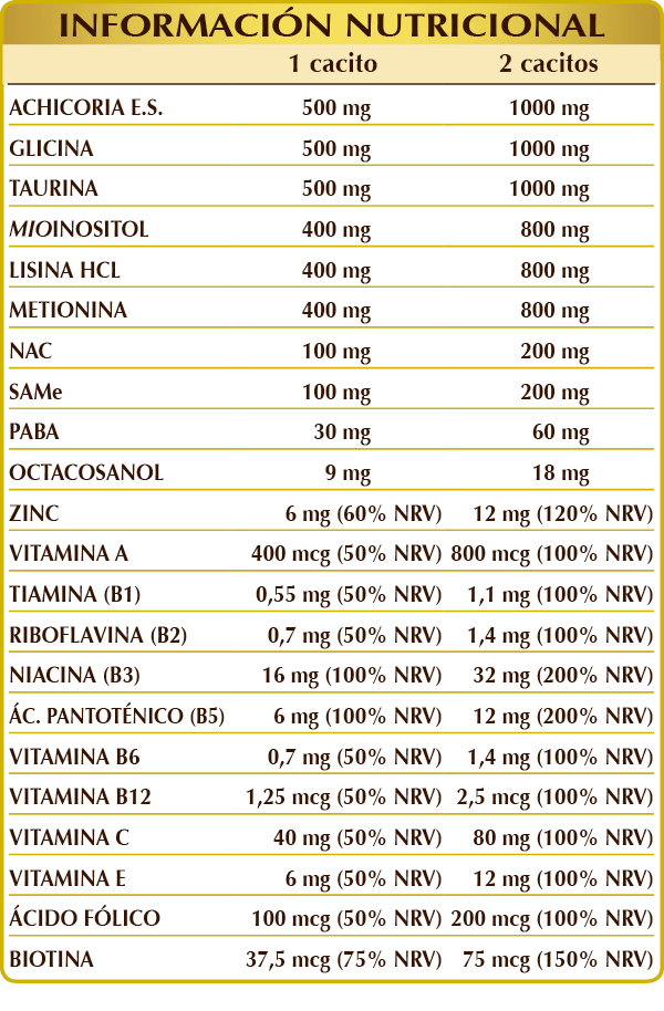 Maltodextrinas de maíz o arroz, achicoria (Cichorium intybus) raíces E.S. (estandarizado al 90 % en inulina), glicina, taurina, mio-inositol de origen vegetal (extracto de semillas de maíz), (L-)lisina HCL o clorhidrato, (L-)metionina, SAMe (tosilato de disulfato de S-adenosil metionina), NAC (N-acetilcisteína), gluconato de zinc, vitamina C (ácido ascórbico), PABA (ácido p-aminobenzoico), vitamina B3 (nicotinamida), policosanoles de caña de azúcar (extracto titulado al 60% de octacosanol), vitamina E de origen vegetal (acetato de D-α-tocoferilo); edulcorantes de origen vegetal: glucósidos de esteviol de stevia, taumatina; vitamina B5 (pantotenato de calcio), vitamina A (acetato de retinilo), vitamina B2 activada (riboflavina 5-fosfato sódico), vitamina B6 activada (piridoxal-5-fosfato), vitamina B1 (clorhidrato de tiamina), ácido fólico activado (L-metilfolato cálcico), biotina, vitamina B12 activada (5-desoxiadenosilcobalamina, metilcobalamina).