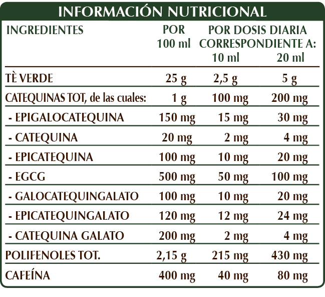 Los complementos alimenticios no sustituyen una dieta variada y equilibrada y deben utilizarse en el ámbito de un estilo de vida saludable. No superar la dosis diaria recomendada. Mantener el producto fuera del alcance de los niños de menos de tres años de edad. No consumir con el estómago vacío ni en el mismo día en que se tomen otros productos que contengan té verde (se recomienda no tomar una cantidad diaria de EGCG igual o superior a 800 mg). El producto no debe ser consumido por mujeres embarazadas o en período de lactancia ni por menores de 18 años.