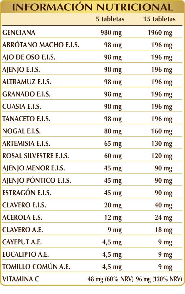Genciana (Gentiana lutea) raíces Plv, celulosa microcristalina°, goma arábiga°, abrótano (Artemisia abrotanum) sumidades E.I.S., ajo de oso (Allium ursinum) hojas E.I.S., ajenjo mayor o romano (Artemisia absinthium) hierba con flores E.I.S., altramuz (Lupinus albus) semillas E.I.S., granado (Punica granatum) corteza de los frutos E.I.S., cuasia (Quassia amara) madera E.I.S., tanaceto (Tanacetum vulgare) hierba con flores E.I.S., nogal (Juglans regia) frutos frescos inmaduros (verdes) y hojas E.I.S., artemisa (Artemisia vulgaris) hierba con flores E.I.S., dióxido de silicio°°, rosal silvestre (Rosa canina) frutos E.I.S. (titulado al 70% en vitamina C), ajenjo gentil (Artemisia pontica) hierba con flores E.I.S., ajenjo póntico (Artemisia vallesiaca) hierba con flores E.I.S., estragón (Artemisia dracunculus) hojas E.I.S., clavero (Eugenia caryophyllata) yemas florales E.I.S., estearato de magnesio de origen vegetal°°, acerola (Malpighia glabra) frutos E.S. (titulado al 50 % en vitamina C), clavero (Eugenia caryophyllata) yemas florales E.I.S., cayeput (Melaleuca leucadendron var. cajaputi) hojas A.E., eucalipto (Eucalyptus globulus) hojas y ramitas A.E., tomillo común (Thymus vulgaris) hojas A.E. Plv= Polvo