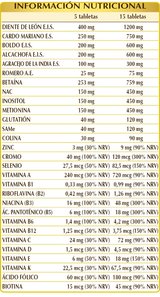 Diente de león (Taraxacum officinale) raíces E.I.S., celulosa microcristalina°, goma arábiga°, betaína, cardo mariano (Silybum marianum) frutos E.S. (estandarizado al 80 % en silimarina), boldo (Peumus boldus) hojas E.I.S., alcachofa (Cynara scolymus) hojas E.I.S., mio-inositol de origen vegetal (extraído de semillas de maíz), NAC (N-acetilcisteína), agracejo de la India (Berberis aristata) cortezas E.S. (titulado al 97 % en berberina), SAMe (S-adenosil metionina tosilato de disulfato), tartrato de colina, dióxido de silicio°°, glutatión reducido, romero (Rosmarinus officinalis) sumidades floridas A.E., vitamina C (ácido ascórbico), vitamina B3 (nicotinamida), gluconato de zinc, vitamina E de origen vegetal (acetato de D-α-tocoferol), estearato de magnesio de origen vegetal°°, vitamina B5 (pantotenato de calcio), vitamina B6 activada (piridoxal-5-fosfato), vitamina A (acetato de retinilo), vitamina B2 activada (riboflavina 5-fosfato sódico), liquen de los renos (Cladonia rangiferina) talo E.S. (titulado en vitamina D3 colecalciferol 100 000 UI/g), Vitamina B1 (clorhidrato de tiamina), picolinato de cromo, selenito de sodio, ácido fólico activado (L-metilfolato de calcio), vitamina K1 (filoquinona), biotina, vitamina B12 activada (5-deoxiadenosilcobalamina, metilcobalamina). °Agente de carga. °°Antiaglomerante
