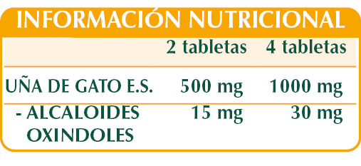 Uña de gato (Uncaria tomentosa) cortezas E.S. (titulado al 3 % en alcaloides oxindoles), maltodextrinas de maíz o arroz, celulosa microcristalina°, goma arábiga°, dióxido de silicio°°, estearato de magnesio de origen vegetal°°.
