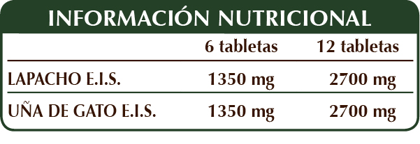 Lapacho (Tecoma curialis o Tabebuia avellanedae) cortezas E.I.S., uña de gato (Uncaria tomentosa) cortezas E.I.S., celulosa microcristalina°, goma arábiga°, dióxido de silicio°°, estearato de magnesio de origen vegetal°°.
