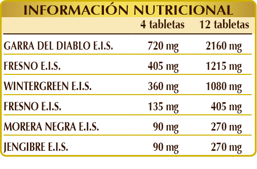 Garra del diablo (Harpagophytum procumbens) raíces E.I.S., fresno (Fraxinus excelsior) hojas E.I.S., gaulteria (Gaultheria procumbens) hojas E.I.S., matricaria (Tanacetum parthenium) hierba con flores E.I.S., celulosa microcristalina°, goma arábiga°, morera negra (Morus nigra) hojas E.I.S., jengibre (Zingiber officinalis) rizomas E.I.S., dióxido de silicio°°, estearato de magnesio de origen vegetal°°. °Agente de carga °°Antiaglomerante