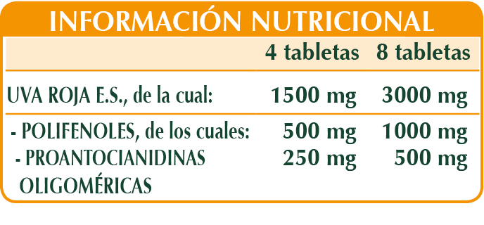 Complemento alimenticio a base de extracto de uva roja que posee una acción antioxidante, contribuye al buen funcionamiento del aparato cardiovascular y favorece una adecuada microcirculación, combatiendo la sensación de pesadez en las piernas.
