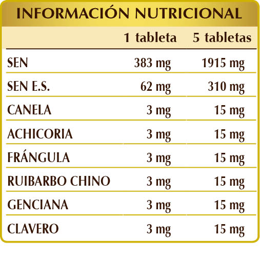 Sen (Cassia angustifolia) hojas Plv, sen (Cassia angustifolia) hojas E.S., goma arábiga°, celulosa microcristalina°, dióxido de silicio°°, canela (Cinnamomum zeylanicum) cortezas Plv, achicoria (Cichorium intybus) raíces Plv, frángula (Rhamnus frangula) cortezas Plv, ruibarbo chino (Rheum palmatum) rizomas Plv, genciana (Gentiana lutea) raíces Plv, clavero (Eugenia caryophyllata) yemas florales Plv, estearato de magnesio de origen vegetal°°. Plv= Polvo