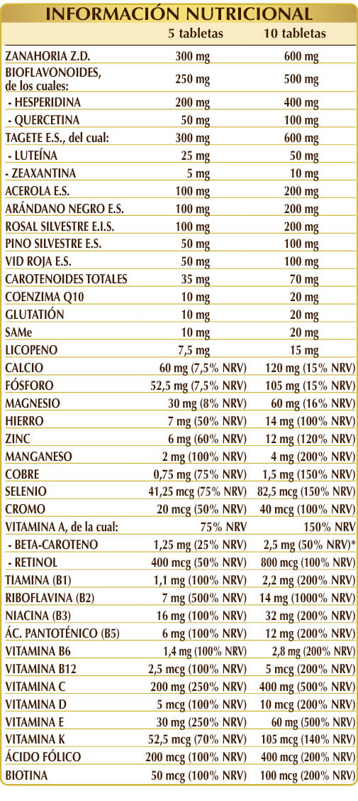Zanahoria (Daucus carota) raíces J.D., tagete (Tagetes erecta) cálices (flores) E.S. (estandarizado al 10 % en luteína), fosfato cálcico dibásico, celulosa microcristalina°, goma arábiga°, hesperidina procedente de cítricos, maltodextrinas de maíz o arroz, acerola (Malpighia glabra) frutos E.S. (estandarizado al 50 % en vitamina C), arándano negro (Vaccinium myrtillus) frutos E.S. (estandarizado al 25 % en antocianinas), rosal silvestre (Rosa canina) frutos E.S. (estandarizado al 70 % en vitamina C), vitamina C (ácido ascórbico), tomatera (Solanum lycopersicum) frutos E.S. (estandarizado al 10 % en licopeno), vitamina E de origen vegetal (acetato de D-α-tocoferol), gluconato de hierro, glicerofosfato de magnesio, quercetina, pino silvestre (Pinus sylvestris) cortezas E.S. (estandarizado al 90 % en proantocianidinas oligoméricas), tagete (Tagetes erecta) cálices (flores) E.S. (estandarizado al 10 % en zeaxantina), vid roja (Vitis vinifera) semillas E.S. (estandarizado al 95 % en proantocianidinas oligoméricas), gluconato de zinc, óxido de magnesio, dióxido de silicio°°, SAMe (S-adenosil metionina tosilato de disulfato), gluconato de manganeso, vitamina B3 (nicotinamida), dunaliella (Dunaliella salina) tallo (algas) E.S. (estandarizado al 10 % en beta-caroteno), vitamina B2 activada (riboflavina 5-fosfato de sodio), estearato de magnesio de origen vegetal°°, coenzima Q10, glutatión reducido, carbonato de calcio, vitamina B5 (pantotenato de calcio), sulfato de cobre, vitamina A (acetato de retinilo), vitamina B6 activada (piridoxal-5-fosfato), liquen de los renos (Cladonia rangiferina) talo E.S. (estandarizado en vitamina D3 colecalciferol 100 000 UI/g), vitamina B1 (clorhidrato de tiamina), ácido fólico activado (L-metilfolato de calcio), cromo picolinato, selenito de sodio, vitamina K1 (filoquinona), biotina, vitamina B12 activada (5-deoxiadenosilcobalamina, metilcobalamina). °Agente de carga. °°Antiaglomerante