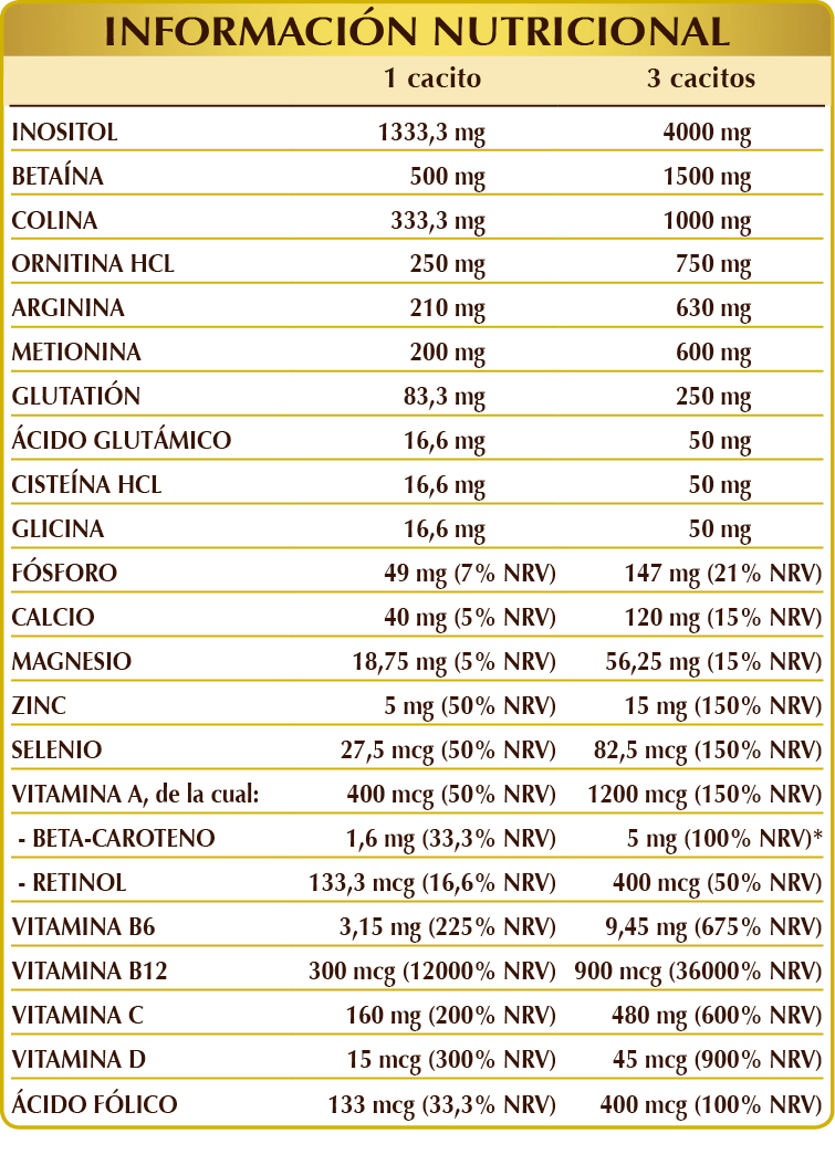 Mio-Inositol de origen vegetal (extraído de semillas de maíz), maltodextrinas de maíz o arroz, tartrato de colina, betaína base, (L-)ornitina HCL o clorhidrato, glicerofosfato de calcio, (L-)arginina, (L-)metionina, glicerofosfato de magnesio, vitamina C (ácido ascórbico), glutatión reducido, ácido (L-)glutámico, (L-)cisteína HCL o clorhidrato, glicina, dunaliella (Dunaliella salina) talo (alga) E.S. (estandarizado al 10% en betacaroteno), vitamina B6 activada (piridoxal-5-fosfato), edulcorantes naturales: glicósidos de esteviol de stevia y taumatina; liquen (Cladonia rangiferina) talo E.S. (titulado en vitamina D3 colecalciferol 100 000 UI/g), vitamina A (acetato de retinilo), vitamina B12 activada (5-desoxiadenosilcobalamina, metilcobalamina), ácido fólico activado (L-metilfolato cálcico), selenito de sodio, vitamina D2 (ergocalciferol) de origen vegetal (extraída de la caña de azúcar).