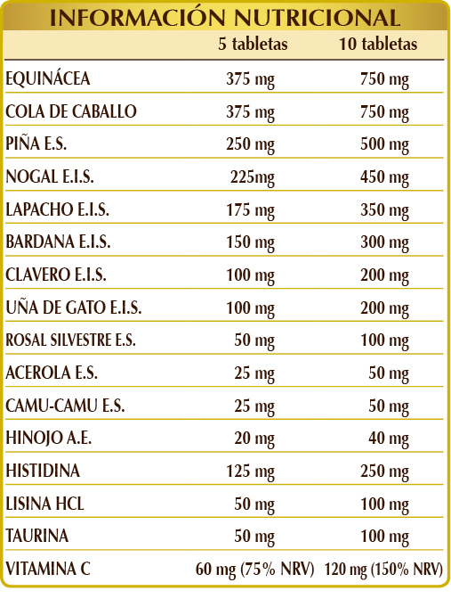 Cola de caballo (Equisetum arvense) hierba Plv, equinácea (Echinacea angustifolia, purpurea y pallida) raíces Plv, piña (Ananas comosus) tallos de los frutos E.S. (bromelina 2500 GDU/g), nogal (Juglans regia) frutos frescos inmaduros (verdes) E.I.S., lapacho (Tecoma curialis o Tabebuia avellanedae) cortezas E.I.S., bardana (Arctium lappa) hierba y raíces frescas E.I.S., celulosa microcristalina°, goma arábica°, (L-)histidina, clavero (Eugenia caryophyllata) yemas florales E.I.S., uña de gato (Uncaria tomentosa) cortezas E.I.S., dióxido de silicio°°, rosal silvestre (Rosa canina) frutos E.S. (titulado al 70 % en vitamina C), (L-)lisina HCL o clorhidrato, taurina, lactato cálcico, fosfato potásico dibásico, acerola E.S. (Malpighia glabra) frutos E.S. (titulado al 50 % en vitamina C), camu-camu (Myrciaria dubia) frutos E.S. (titulado al 50 % en vitamina C), hinojo (Foeniculum vulgare) frutos A.E., estearato de magnesio de origen vegetal°°.