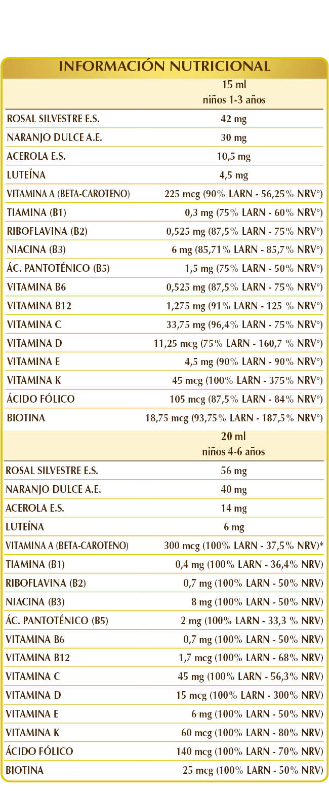 Glicerina vegetal bidestilada, agua pura, tagete (Tagetes erecta) cálices (flores) E.S. (estandarizado al 5% en antocianinas), rosal silvestre (Rosa canina) frutos E.S. Estandarizado al 70% Vitamina C, goma xantana; aroma natural: naranja dulce (Citrus aurantium var. sinensis o dulcis) cáscaras de los frutos O.E.; beta-caroteno (estandarizado al 10 %), acerola (Malpighia glabra) frutos (estandarizado al 50 % en vitamina C), vitamina E (acetato de DL-α-tocoferol), vitamina B3 (nicotinamida), vitamina D3 (colecalciferol 100.000 UI/g), vitamina B5 (pantotenato de calcio), vitamina B2 activada (riboflavina 5-fosfato de sodio), vitamina B6 activada (piridoxal-5-fosfato), vitamina B1 (clorhidrato de tiamina), ácido fólico activado (L-metilfolato de calcio), vitamina K1 (filoquinona), biotina, vitamina B12 activada (5-desoxiadenosilcobalamina, metilcobalamina).