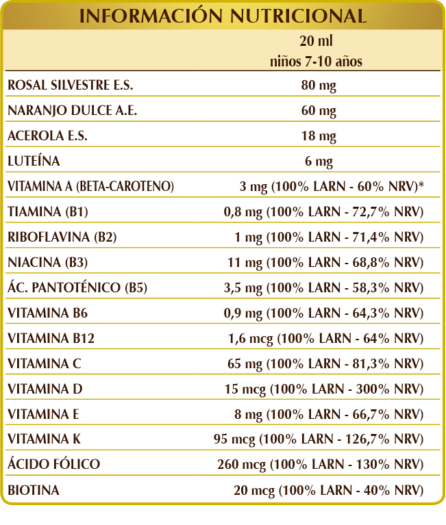 Glicerina vegetal bidestilada, agua pura, tagete (Tagetes erecta) cálices (flores) E.S. (titulado al 5 % en luteína), rosal silvestre (Rosa canina) frutos E.S. (titulado al 70 % en vitamina C); aroma natural: naranjo dulce (Citrus aurantium var. sinensis o dulcis) cáscaras de los frutos A.E.; goma xantana, zanahoria (Daucus carota) raíces E.S. (titulado al 10 % en beta-caroteno), vitamina E (acetato de DL-α-tocoferol), acerola (Malpighia glabra) frutos (titulado al 50 % en vitamina C), vitamina B3 (nicotinamida), vitamina D3 (colecalciferol), vitamina B5 (pantotenato de calcio), vitamina K1 (filoquinina), vitamina B6 (clorhidrato de piridoxina), vitamina B2 (riboflavina), vitamina B1 (clorhidrato de tiamina), ácido fólico, biotina, vitamina B12 (cianocobalamina).