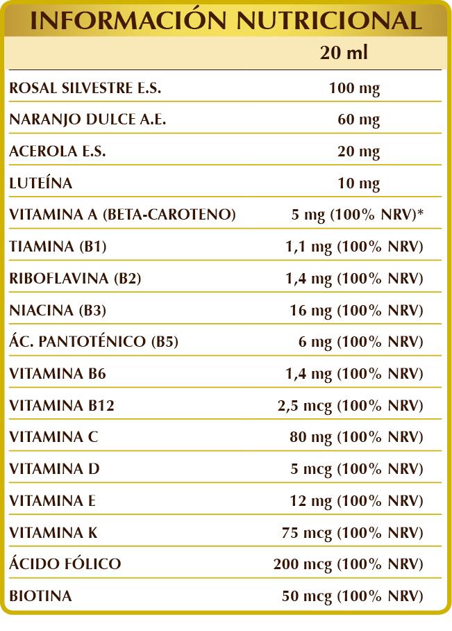 Glicerina vegetal bidestilada, agua pura, tagete (Tagetes erecta) cálices (flores) E.S. (titulado al 5 % en luteína), rosal silvestre (Rosa canina) frutos E.S. (titulado al 70 % en vitamina C); aroma natural: naranjo dulce (Citrus aurantium var. sinensis o dulcis) cáscaras de los frutos A.E.; goma xantana, zanahoria (Daucus carota) raíces E.S. (titulado al 10 % en beta-caroteno), vitamina E (acetato de DL-α-tocoferol), acerola (Malpighia glabra) frutos (titulado al 50 % en vitamina C), vitamina B3 (nicotinamida), vitamina B5 (pantotenato de calcio), vitamina D3 (colecalciferol), vitamina B6 (clorhidrato de piridoxina), vitamina K1 (filoquinina), vitamina B1 (clorhidrato de tiamina), vitamina B2 (riboflavina), ácido fólico, biotina, vitamina B12 (cianocobalamina).