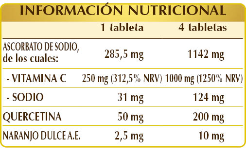 Vitamina C (ascorbato de sodio), celulosa microcristalina°, quercetina de origen vegetal, fosfato de calcio dibásico°, goma arábiga°, dióxido de silicio°°, estearato de magnesio de origen vegetal°°, aroma natural: A.E. de cáscara de naranja dulce (Citrus aurantium var. sinensis o dulcis).