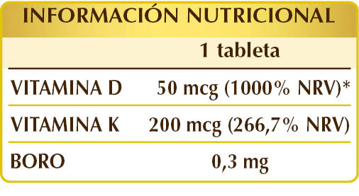 Celulosa microcristalina°, goma arábiga°, fosfato cálcico dibásico, carbonato de calcio, liquen (Cladonia rangiferina) talo E.S. (titulado en vitamina D3 colecalciferol 100.000 UI/g), maltodextrinas de maíz o arroz, dióxido de silicio°°, estearato de magnesio de origen vegetal°°, borato de sodio, vitamina K2 o MK-7 (menaquinona) de natto (semillas de soja fermentadas).