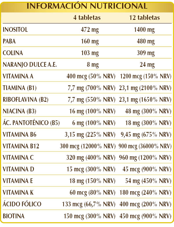 Complemento alimenticio que contiene todas las vitaminas y otras sustancias con efecto nutritivo y fisiológico, como inositol, PABA y colina. Las vitaminas B6 y B12 favorecen la formación normal de los glóbulos rojos y, junto a las vitaminas B2, B3, B5 y C y al ácido fólico, reducen el cansancio y la fatiga. Las vitaminas B1, B3, B6, B12 y C y la biotina contribuyen al correcto funcionamiento del sistema nervioso y, en conjunción con el ácido fólico, son útiles para mantener una correcta función psicológica. El ácido fólico y las vitaminas A, B6, B12, C y D favorecen el buen funcionamiento del sistema inmunitario. La biotina mejora la salud del cabello y, junto a las vitaminas A, B2, B3 y C, ayuda a conservar el bienestar de la piel. Las vitaminas D y K contribuyen a mantener los huesos sanos, mientras que las vitaminas A y B2 son necesarias para conservar la capacidad visual. Finalmente, las vitaminas B2, C y E protegen a las células del estrés oxidativo. Además, la colina contribuye al metabolismo normal de la homocisteína y de los lípidos y apoya la función hepática normal.