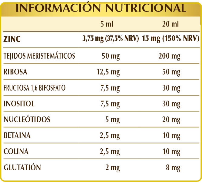 Glicerina vegetal bidestilada, agua pura; macerado glicerinado de tejidos meristemáticos frescos: roble (Quercus peduncolata sinónimo Quercus robur) yemas, nogal (Juglans regia) yemas, frambueso (Rubus idaeus) jóvenes brotes, castaño de Indias (Aesculus hippocastanum) yemas (libres de escina); gluconato de zinc, ribosa, fructosa 1,6-bifosfato; corrector de acidez: ácido cítrico; inositol, citrato de betaína, tartrato de colina; mezcla de nucleótidos: AMP (monofosfato de adenosina), CMP (monofosfato de citosina), GMP (monofosfato de guanosina), UMP (monofosfato de uridina); glutatión reducido; edulcorante de origen natural: taumatina.