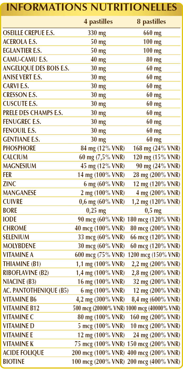 Oseille crépue (Rumex crispus) racines E.S., phosphate de calcium dibasique, cellulose microcristalline°, gomme arabique°, citrate d'ammonium ferrique, acérola (Malpighia glabra) fruits E.S. (standardisé à 50% en vitamine C), églantier (Rosa canina) fruits E.I.S. (standardisé à 70% en vitamine C), gluconate de zinc, camu-camu (Myrciaria dubia) fruits E.S. (standardisé à 50% en vitamine C), dioxyde de silicium°°, angélique sylvestre (Angelica sylvestris) racines E.I.S., anis vert (Pimpinella anisum) fruits E.I.S., carvi ou cumin des prés (Carum carvi) fruits E.I.S., cresson de fontaine (Nasturtium officinale) herbe E.I.S., cuscute du thym (Cuscuta epithymum) herbe E.I.S., prêle des champs ou queue de cheval (Equisetum arvense) herbe E.I.S., fenugrec (Trigonella foenum-graecum) graines E.I.S., fenouil (Foeniculum vulgare) fruits E.I.S., gentiane (Gentiana lutea) racine E.I.S., oxyde de magnésium, vitamine E d’origine naturelle (acétate de D-α-tocophéryle), gluconate de manganèse, vitamine B3 (nicotinamide), stéarate de magnésium d’origine végétale°°, vitamine B5 (pantothénate de calcium), vitamine B6 activée (pyridoxal 5-phosphate), borate de sodium, gluconate de cuivre, vitamine A (acétate de rétinyle), vitamine B2 activée (riboflavine 5-phosphate de sodium), lichen Cladonia rangiferina) thalle E.S. (standardisé en vitamine D3 cholécalciférol 100 000 UI/g), vitamine B1 (chlorhydrate de thiamine), vitamine B12 activée (5-désoxyadénosylcobalamine, méthylcobalamine), picolinate de chrome, acide folique activé (L-méthylfolate de calcium), iodure de potassium, biotine, molybdate de sodium, vitamine K1 (phylloquinone), sélénite de sodium.
