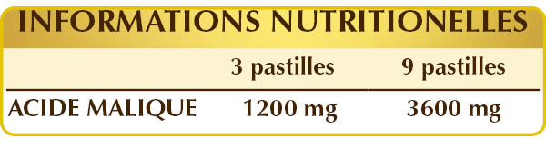 Acide (L-)malique, cellulose microcristalline, gomme arabique, dioxyde de silicium, stéarate de magnésium d’origine végétale.