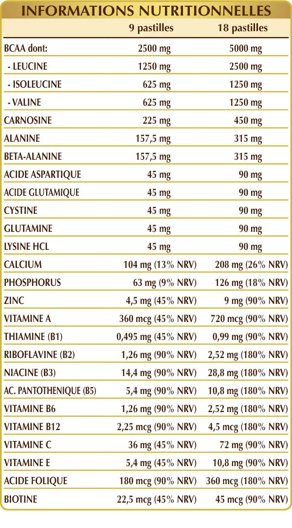 BCAA = Branched-chain amino acids (acides aminés à chaîne ramifiée). NRV= Valeur Nutritionnelle de Référence