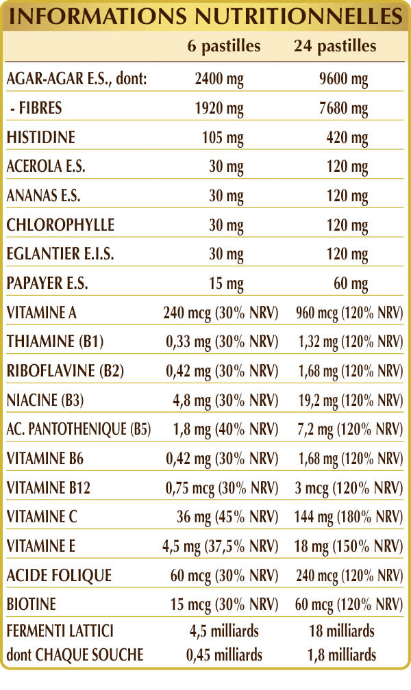 Agar-agar (Gelidium amansii) thalle (algue) E.S., cellulose microcristalline°, gomme arabique°, (L-)histidine, acerola (Malpighia glabra) fruits E.S. (titré à 50% de vitamine C), les tiges d'ananas (Ananas comosus) des fruits E.S. (broméline 2500 GDU/g), clorophylle hydrosoluble (chlorophylline de sodium de magnésium), églantier (Rosa canina) fruits E.I.S. (titré à 70% de vitamine C), dioxyde de silicium°°, mélange de ferments lactiques (titré à 10% dans chacune des souches suivantes : Bifidobacterium bifidum SD5215, breve SD5206, lactis SD5219; Lactobacillus acidophilus SD5212, Brevis SD5214, bulgaricus SD5589, casei SD5213, paracasei SD5275, plantarum SD5209, rhamnosus SD5217), papaya (Carica papaya) fruit E.S. (papaïne 30 000 U/mg), vitamine E (acétate de DL-α-tocophérol), stéarate de magnésium d'origine végétale°°, vitamine B3 (nicotinamide), vitamine B5 (pantothénate de calcium), vitamine A (acétate de rétinyle), vitamine B2 activée (riboflavine 5-phosphate de sodium), vitamine B6 activée (pyridoxal-5-phosphate), vitamine B1 (chlorhydrate de thiamine), acide folique activé (L-méthylfolate de calcium), biotine, vitamine B12 activée (5-désoxyadénosylcobalamine, méthylcobalamine). °Agent de charge °°Agent antiagglomérant