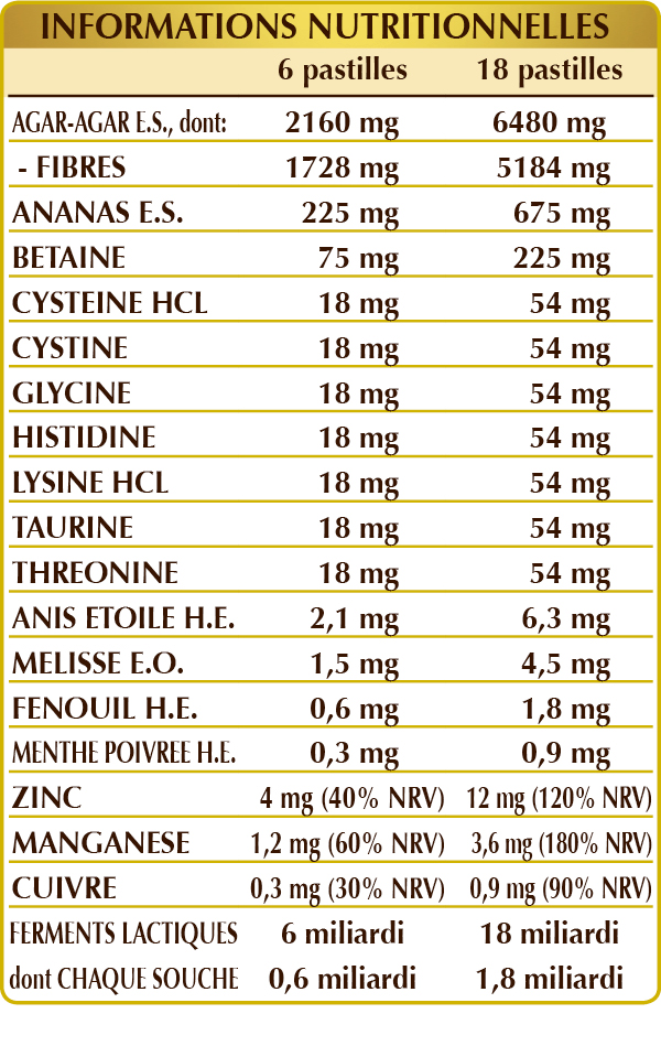 Agar-agar (Gelidium amansii) thalle (algue), ananas (Ananas comosus) tiges des fruits E.S. (broméline 2500 GDU/g), cellulose microcristalline°, gomme arabique°, bétaïne HCL ou chlorhydrate de bétaïne, mélange de ferments lactiques vivants (standardisé à 10% dans chacune des souches ATCC suivantes: Bifidobacterium bifidum SD5215, breve SD5206, lactis SD5219; Lactobacillus acidophilus SD5212, brevis SD5214, bulgaricus SD5589, casei SD5213, paracasei SD5275, plantarum SD5209, rhamnosus SD5217), dioxyde de silicium°°, gluconate de zinc, (L-)cystéine HCL ou chlorhydrate, (L-)cystine, glycine, (L-)histidine, (L-)lysine HCL ou chlorhydrate, taurine, (L-)thréonine, gluconate de manganèse, maltodextrine de maïs ou de riz, stéarate de magnésium d'origine végétale°°, gluconate de cuivre, anis étoilé (Illicium verum) fruits H.E., mélisse (Melissa officinalis) feuilles H.E., fenouil (Foeniculum vulgare) fruits H.E., menthe poivrée (Mentha piperita) feuilles H.E.