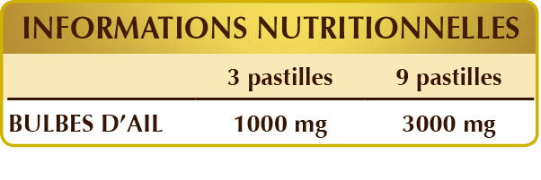 Ail (Allium sativum), bulbes séchés à basse température en poudre, cellulose microcristalline°, gomme arabique°, dioxyde de silicium°°, stéarate de magnésium d'origine végétale°°.