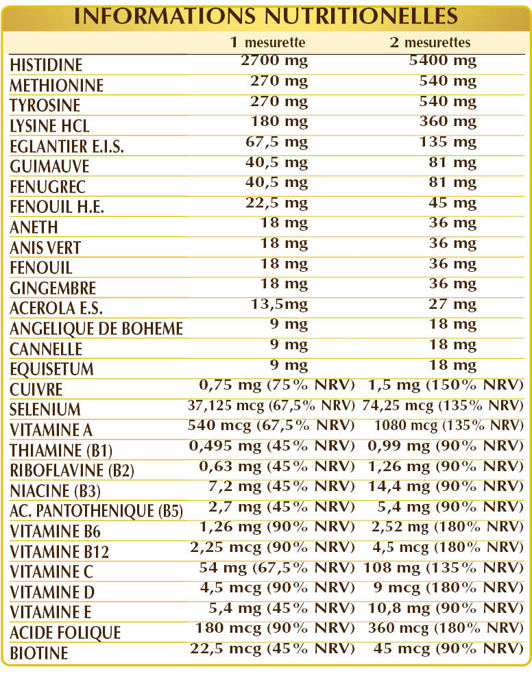 (L-)histidine, maltodextrine de maïs ou de riz, (L-)méthionine, (L-)tyrosine, (L-)lysine, églantier (Rosa canina) fruits E.S. (standardisé à 70% en vitamine C), guimauve officinale (Althaea officinalis) racines Pulv, fenugrec (Trigonella foenum-graecum) graines Pulv, fenouil (Foeniculum vulgare) fruits H.E, aneth (Anethum graveolens) fruits Pulv, anis vert (Pimpinella anisum) fruits Pulv, fenouil (Foeniculum vulgare) fruits Pulv, gingembre (Zingiber officinalis) rhizomes Pulv, acérola (Malpighia glabra) fruits E.S. (standardisé à 50% en vitamine C), vitamine E végétale (acétate de D-α-tocophéryle) ; édulcorants naturels : glycosides de stéviol de stévia, thaumatine ; racines d'angélique de Bohême (Angelica archangelica) Pulv., écorce de cannelle (Cinnamomum zeylanicum) Pulv., herbe de prêle (Equisetum arvense) Pulv., vitamine B3 (nicotinamide), vitamine A (acétate de rétinyle), sulfate de cuivre, vitamine B5 (pantothénate de calcium), vitamine B6 activée (pyridoxal-5-phosphate), vitamine D3 (cholécalciférol 100 000 UI/g), vitamine B2 activée (riboflavine 5-phosphate de sodium), vitamine B1 (chlorhydrate de thiamine), acide folique activé (L-méthylfolate de calcium), sélénite de sodium, biotine, vitamine B12 activée (5-désoxyadénosylcobalamine, méthylcobalamine). Pulv. = Poudre Édulcoré uniquement avec des édulcorants d'origine naturelle.