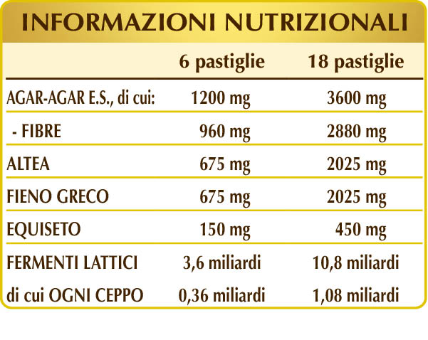 L'agar-agar est une fibre soluble qui n'est pas digérée ni absorbée par l'intestin; elle normalise le volume et la consistance des selles et, ensemble à la guimauve, il favorise la régularité du transit intestinal. La guimauve et le fenugrec sont riches en mucilages et exercent une action émolliente et apaisante sur le système digestif. En outre, les ferments lactiques probiotiques favorisent l'équilibre de la flore bactérienne.