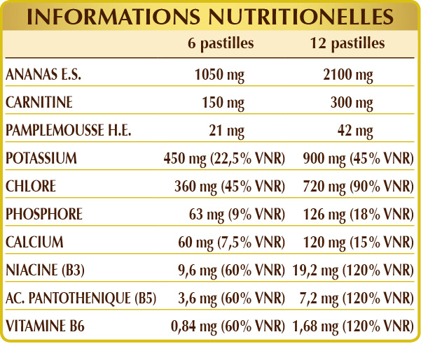 Ananas (Ananas comosus) tiges des fruits E.S. (broméline 2500 GDU/g), chlorure de potassium, cellulose microcristalline°, gomme arabique°, phosphate de calcium dibasique, (L-)carnitine, phosphate de potassium dibasique, citrate de potassium, dioxyde de silicium°°, stéarate de magnésium d'origine végétale°°, pamplemousse (Citrus paradisi) écorces des fruits H.E., vitamine B3 (nicotinamide), vitamine B5 (pantothénate de calcium), vitamine B6 (pyridoxal-5-phosphate).